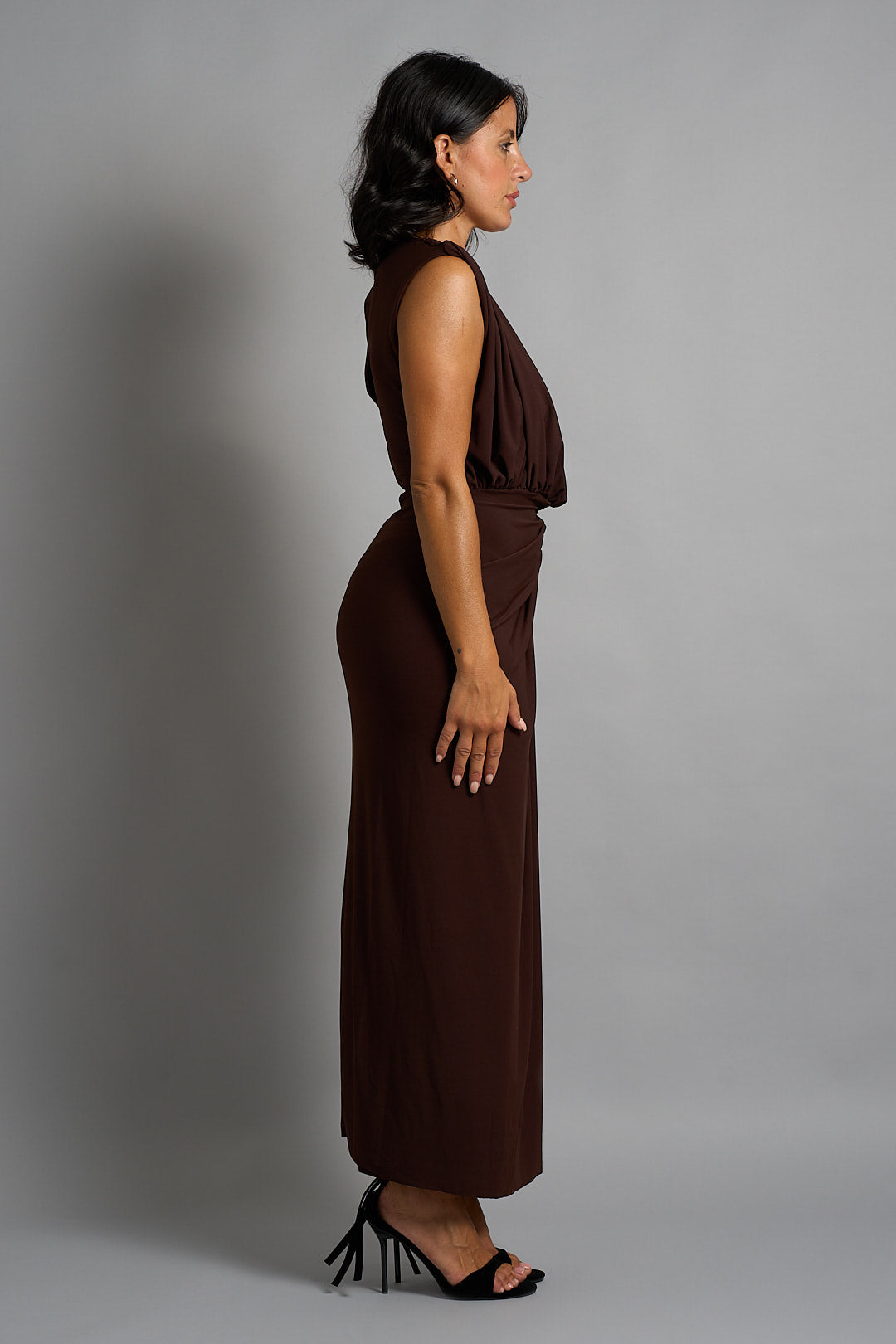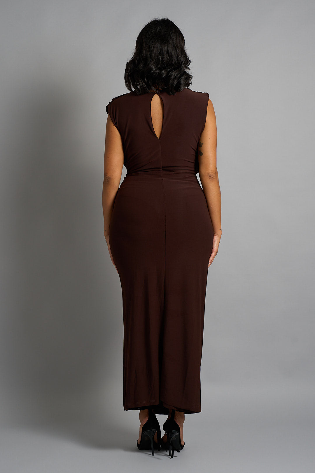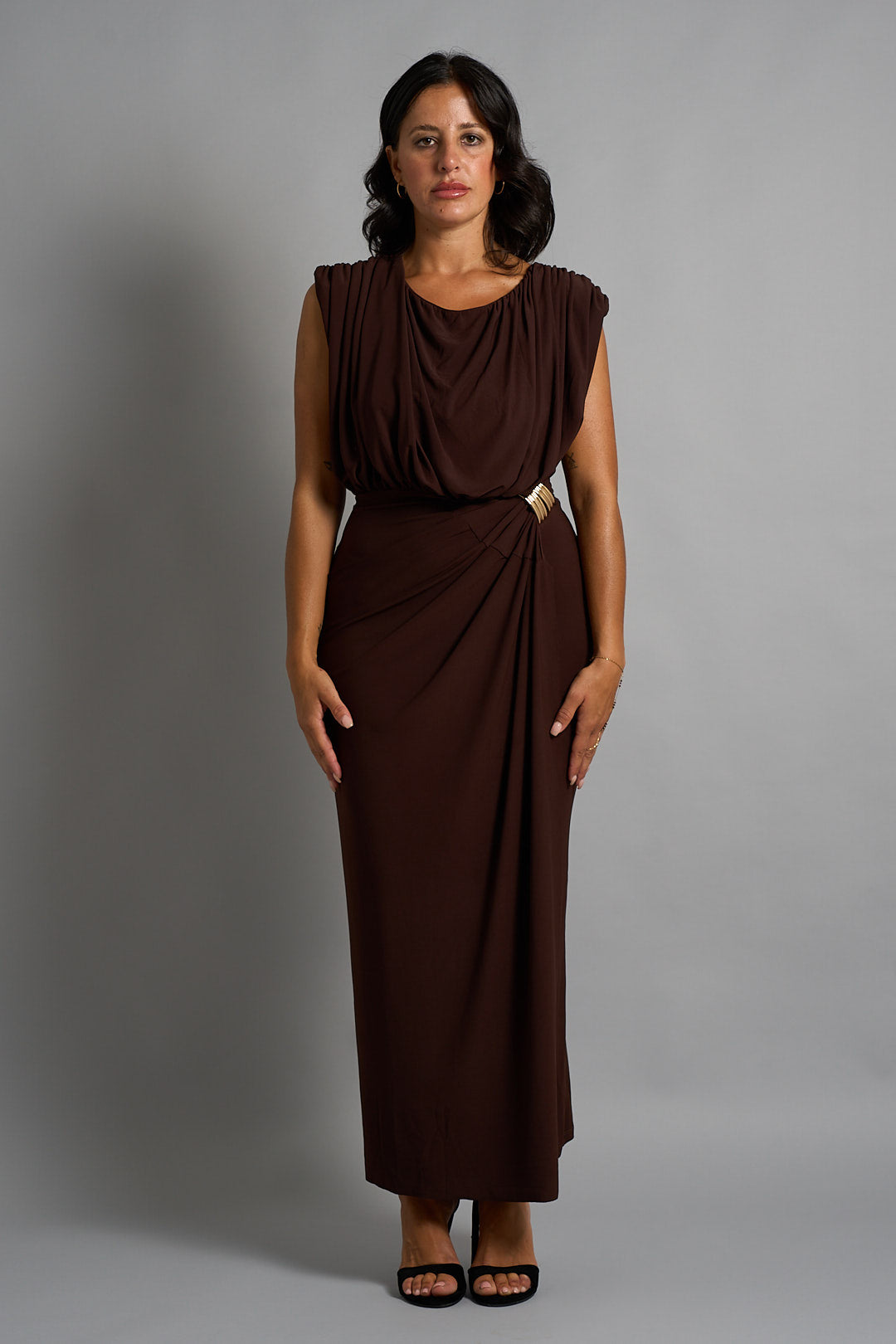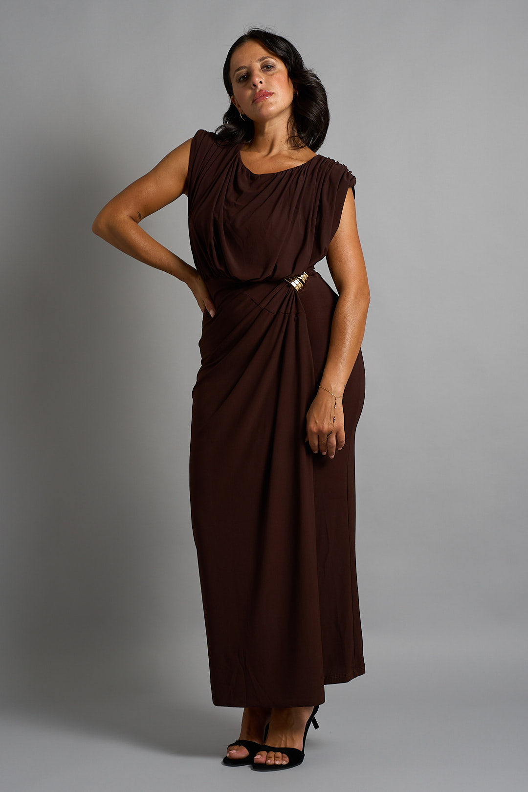 Abito lungo con Drappeggi sulle spalle, Medaglione oro in applicazione e spacco laterale