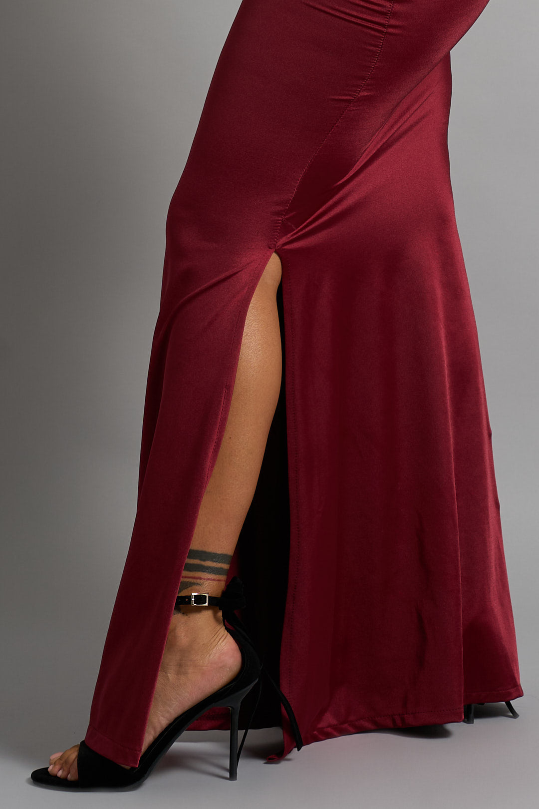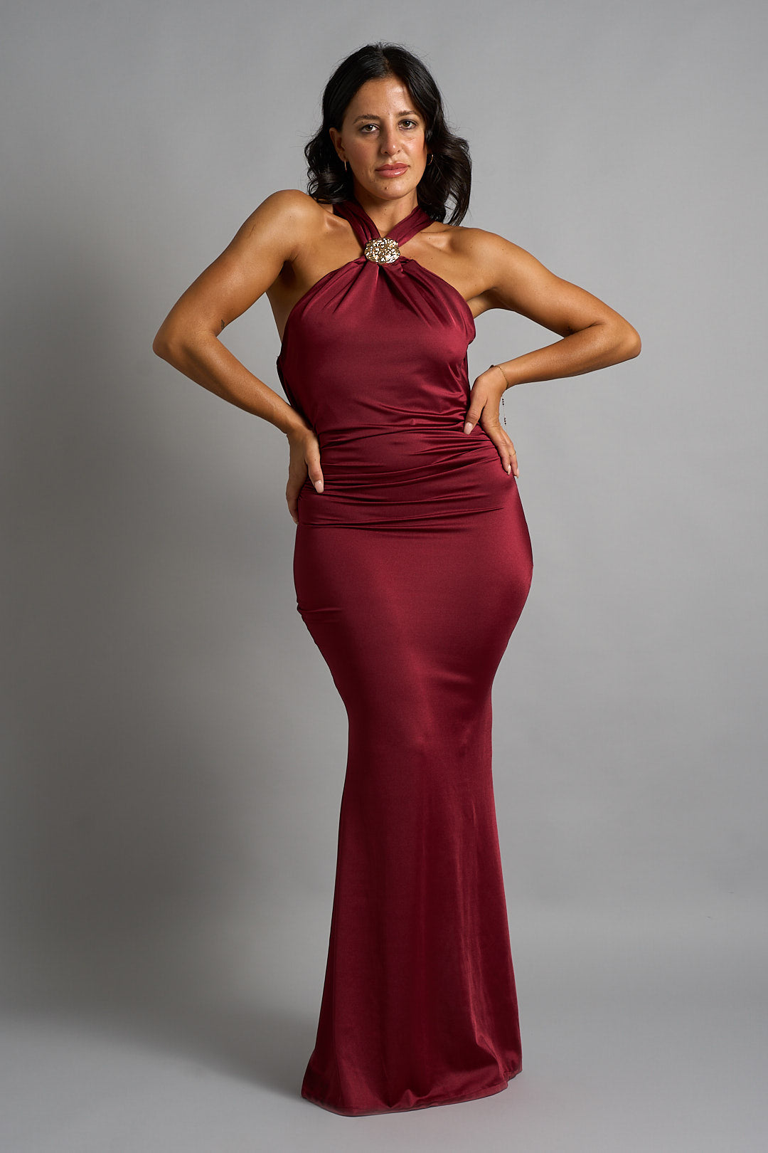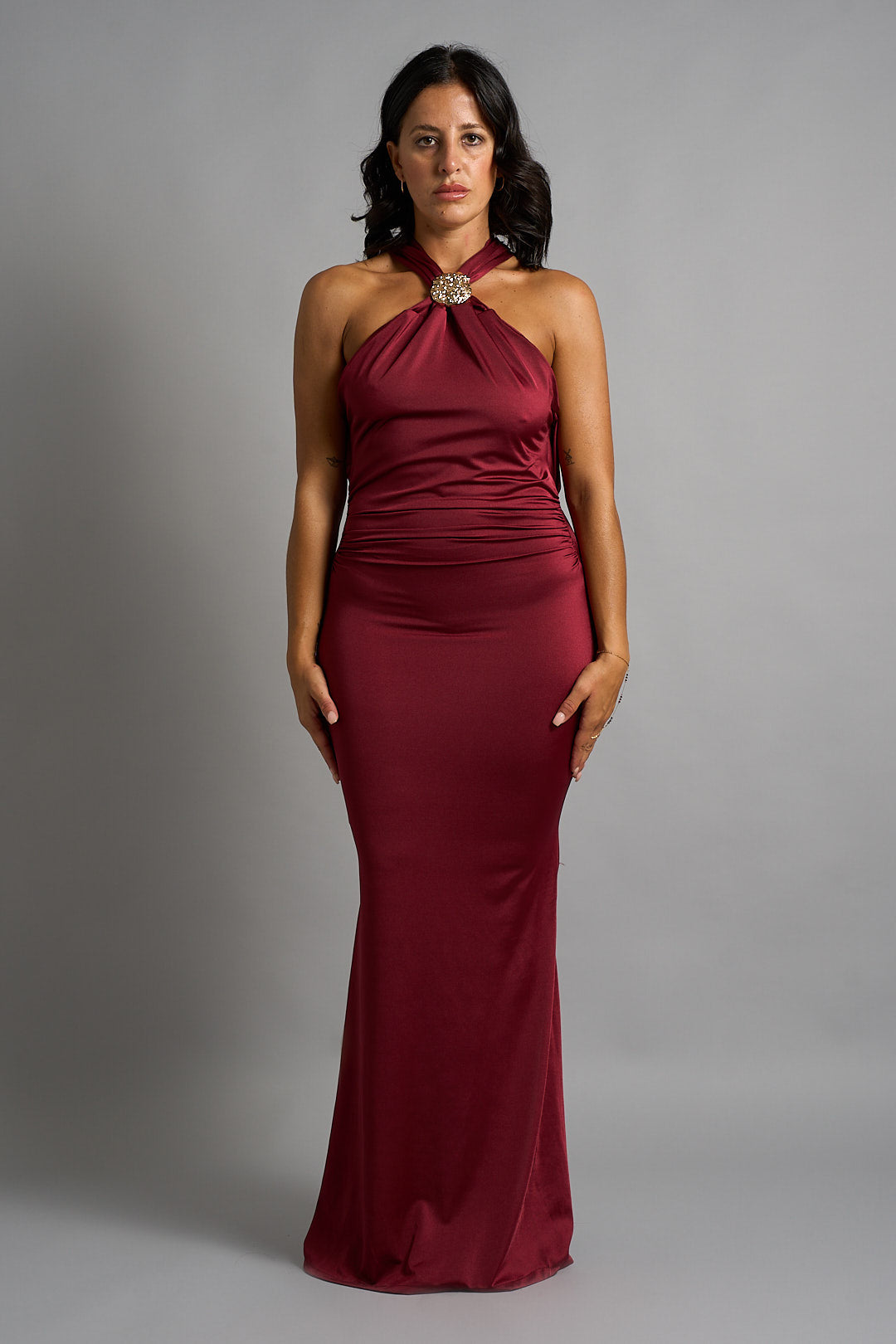 Abito a sirena in tessuto aderente con scollo all’americana, impreziosito da dettaglio gioiello al collo. Drappeggi sul fianco per un effetto sinuoso ed elegante.