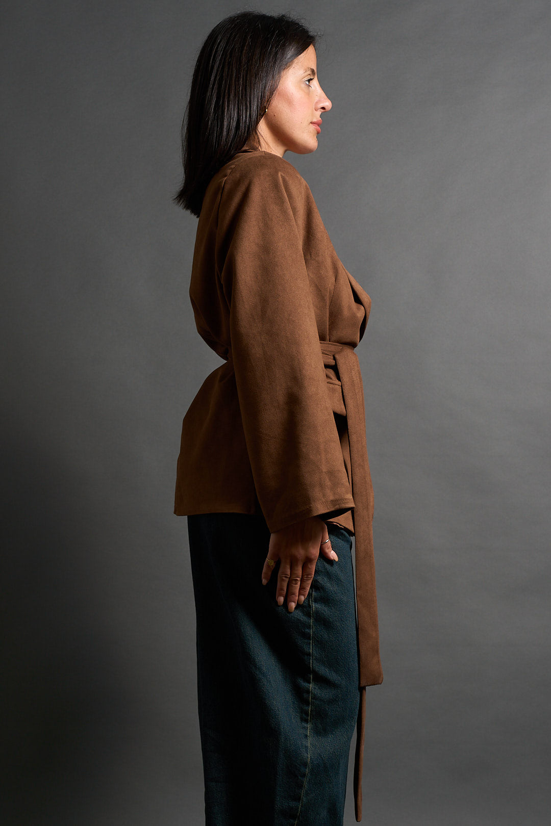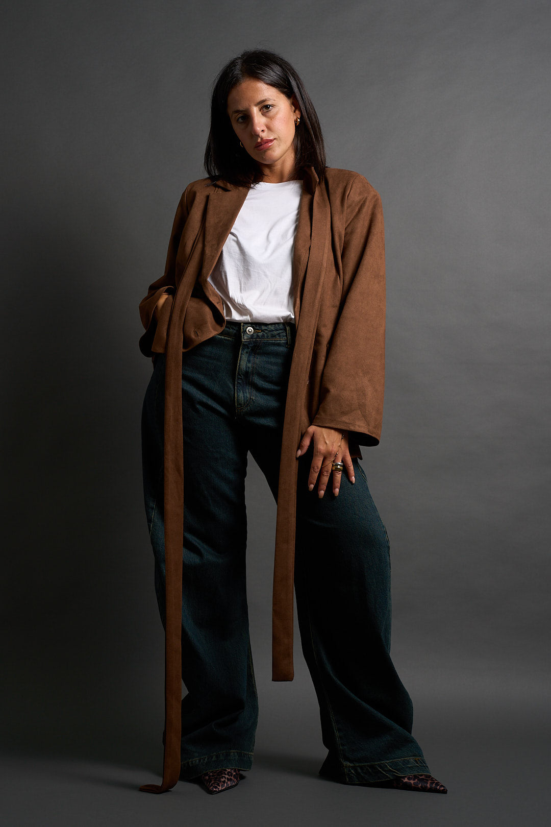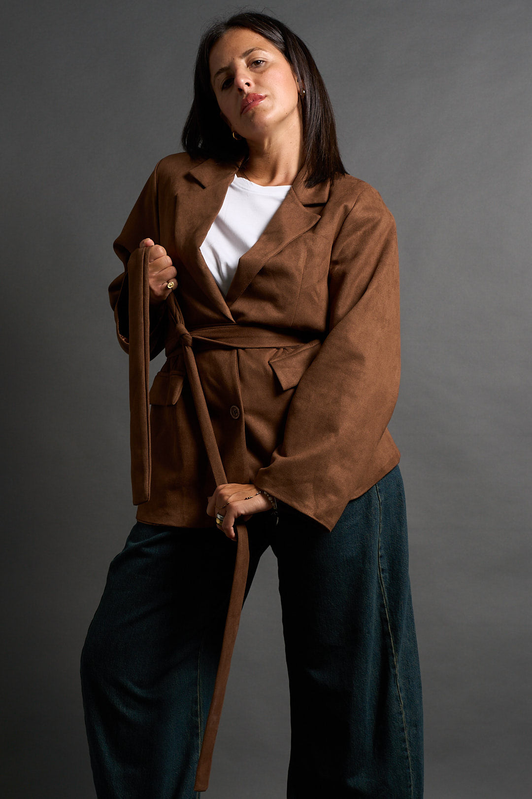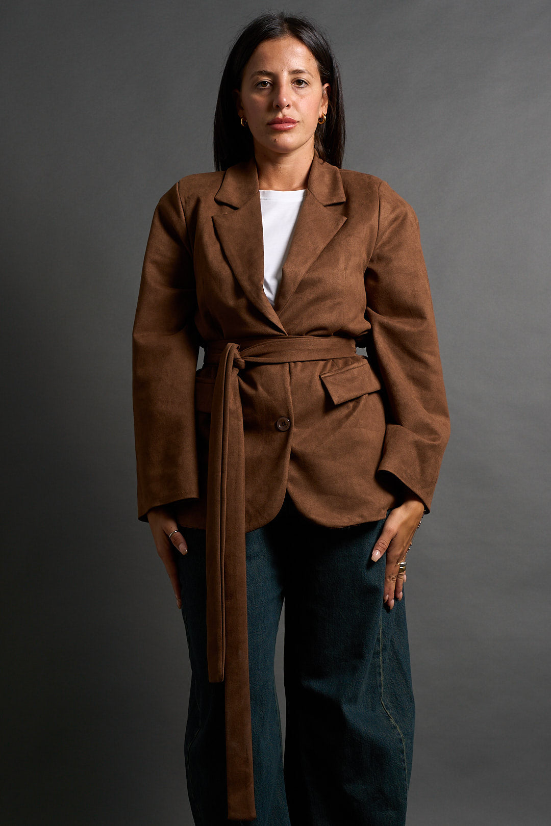 Blazer color cammello dal taglio classico con revers a lancia e chiusura a due bottoni. In coordinato cintura nello stesso tessuto