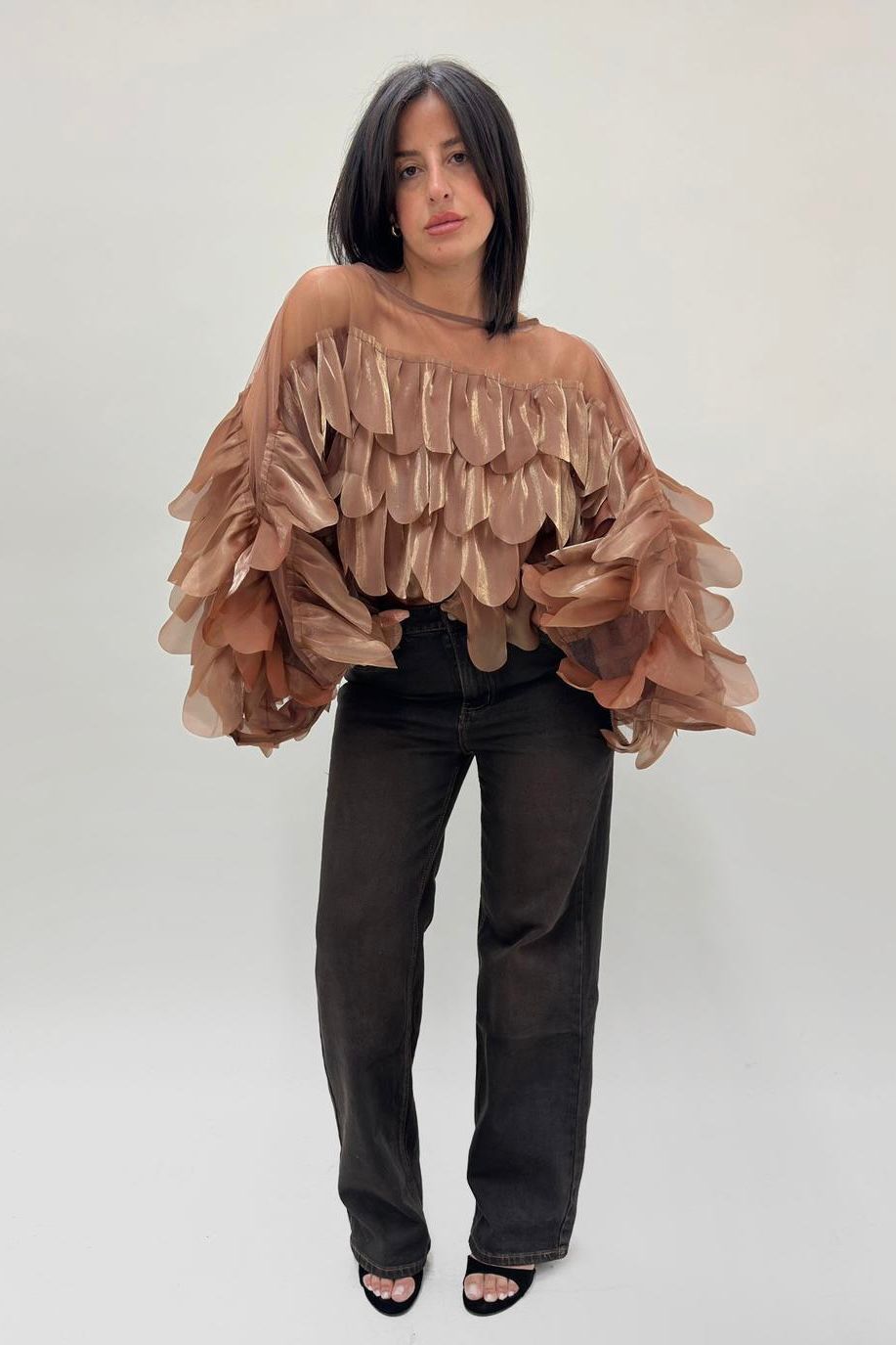 Camicia manica pipistrello con applicazioni a forma di petalo . Scollo tondo tessuto velato