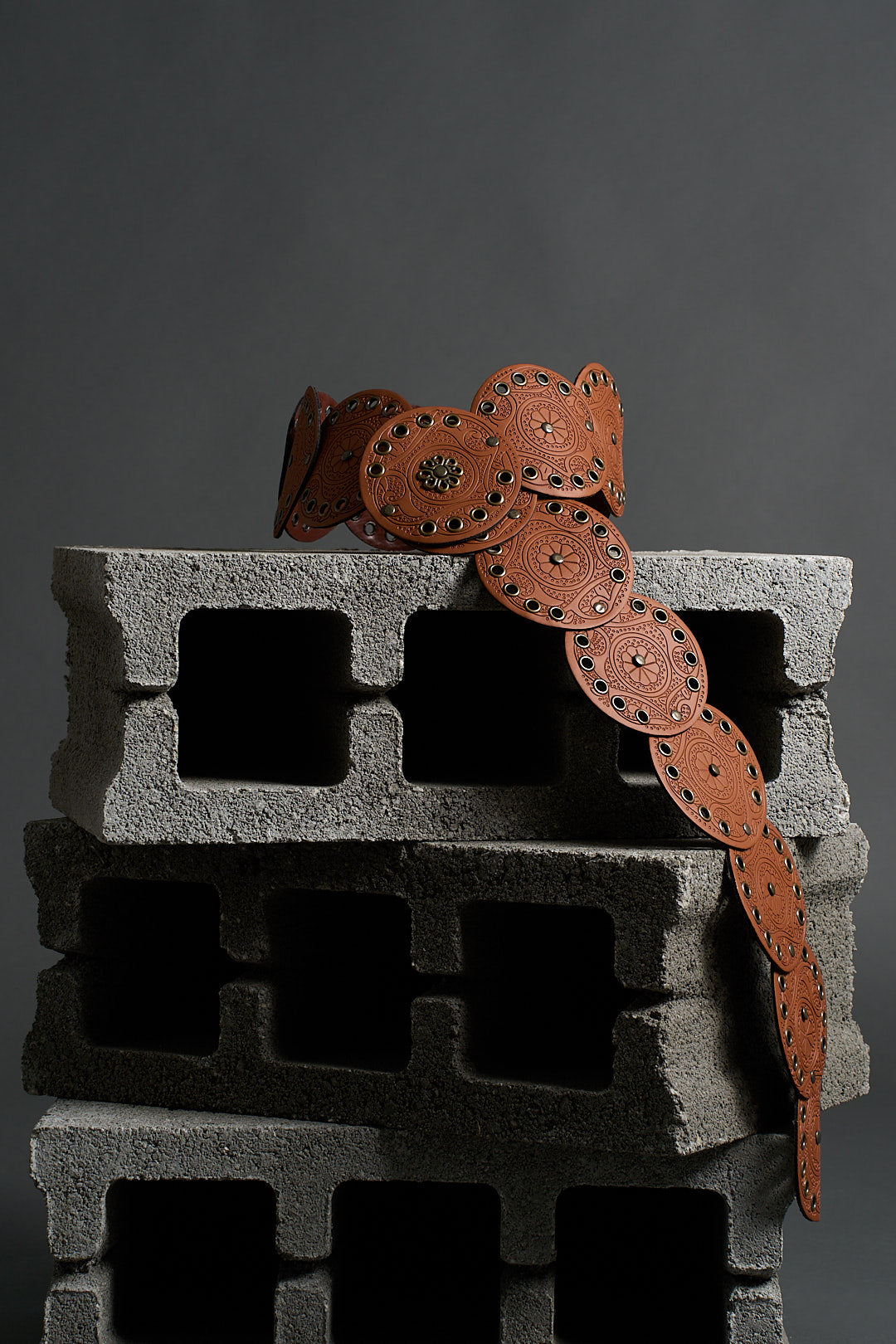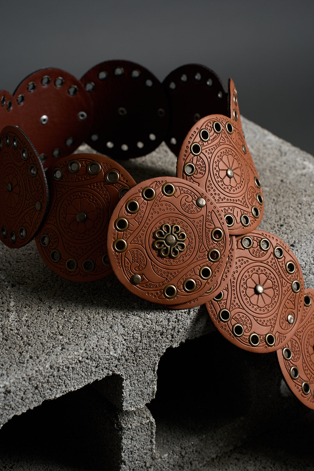 Cintura in similpelle cammello formata da dischi con incisione a rilievo e applicazione borchie