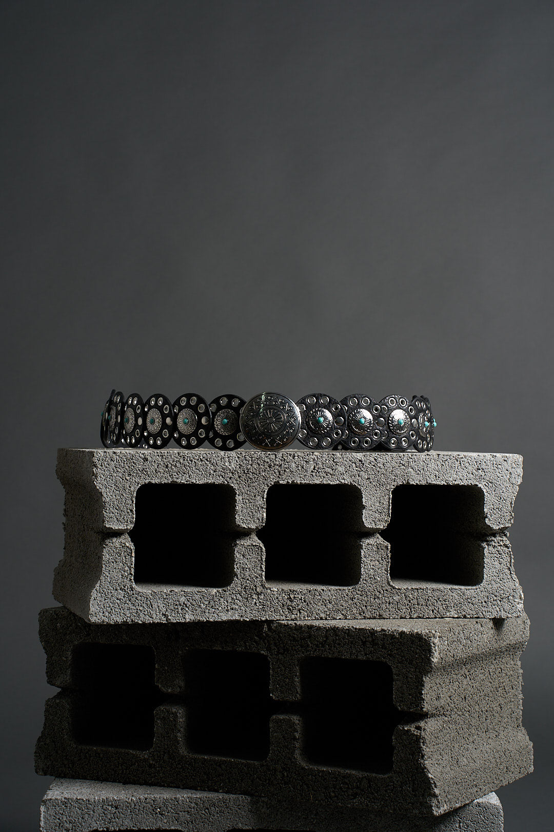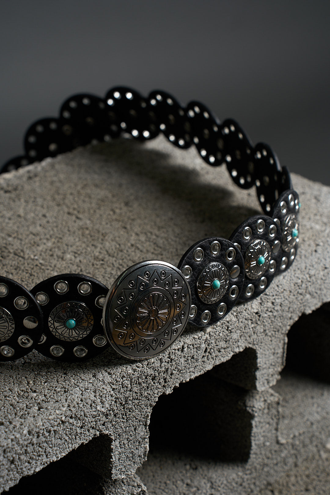 Cintura in similpelle nera formata da dischi con applicazione borchie in metallo.