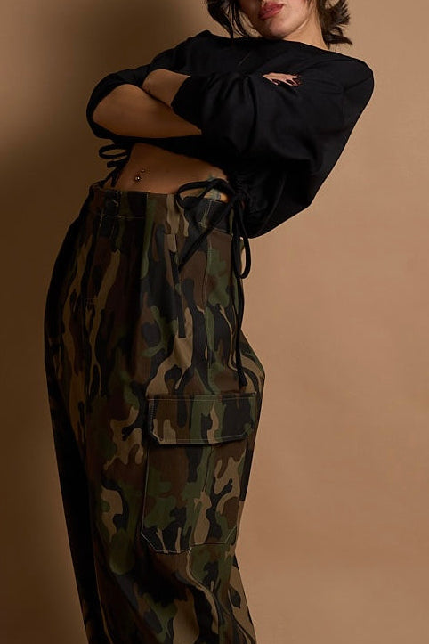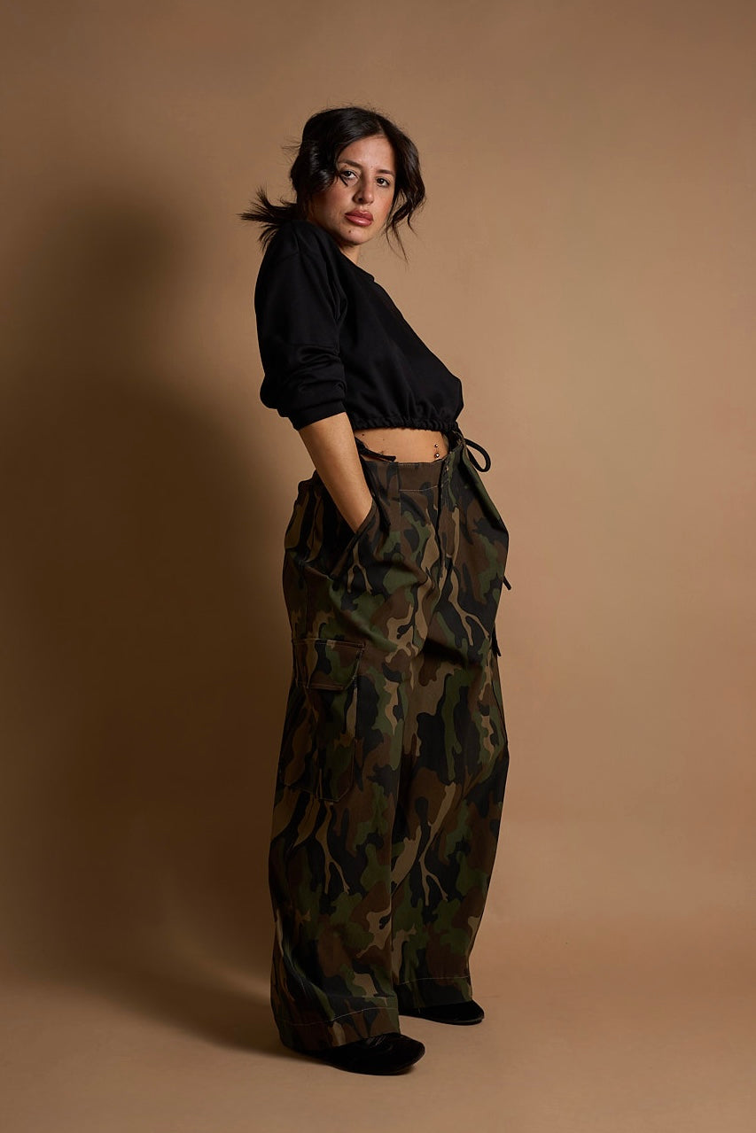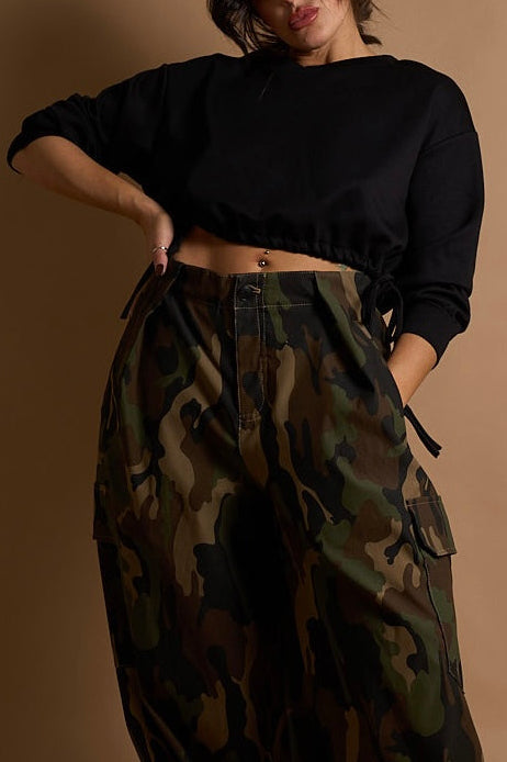 Felpa cropped scollo tondo, polsini sulla manica e arricciatura regolabile in vita.