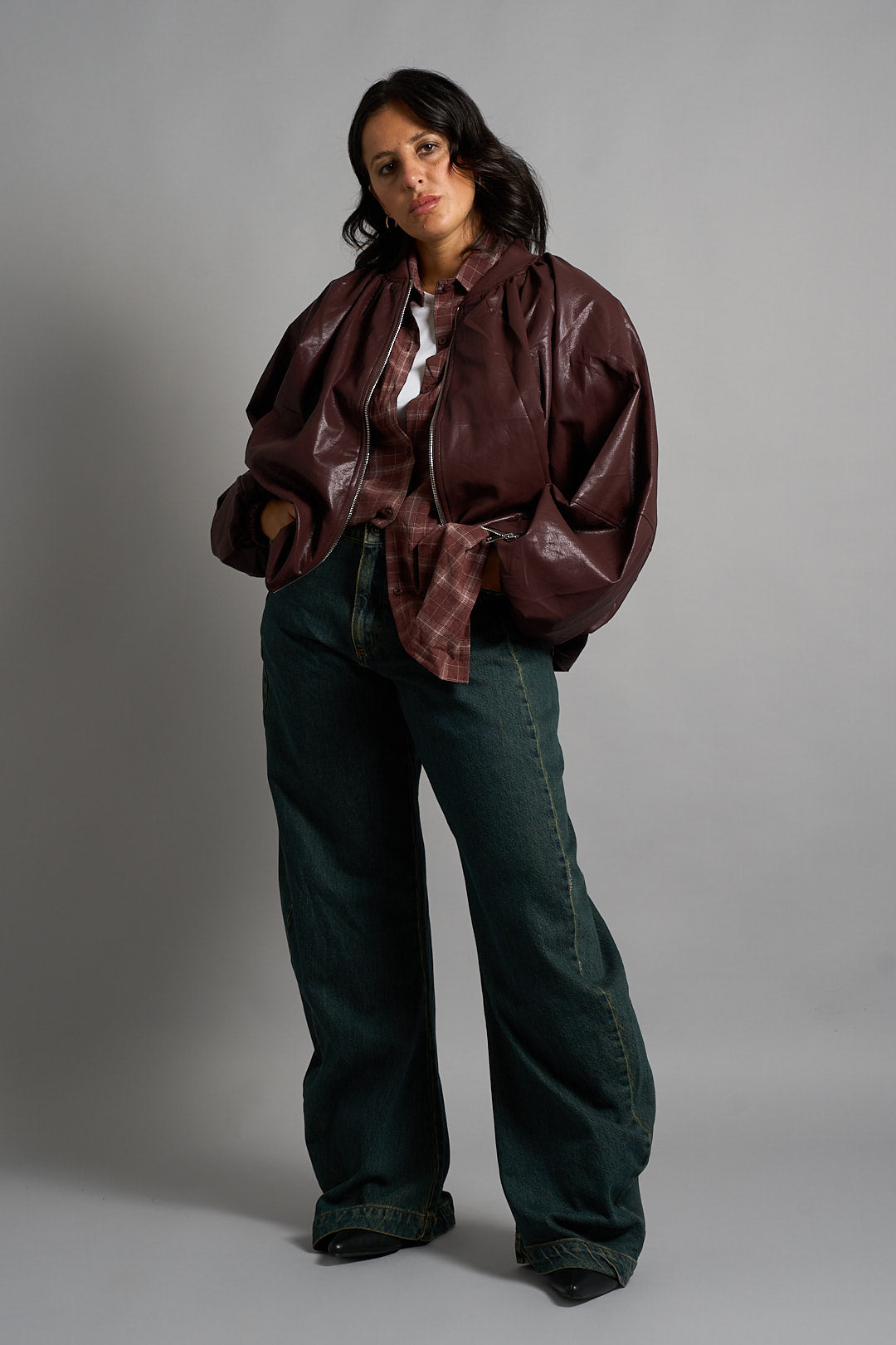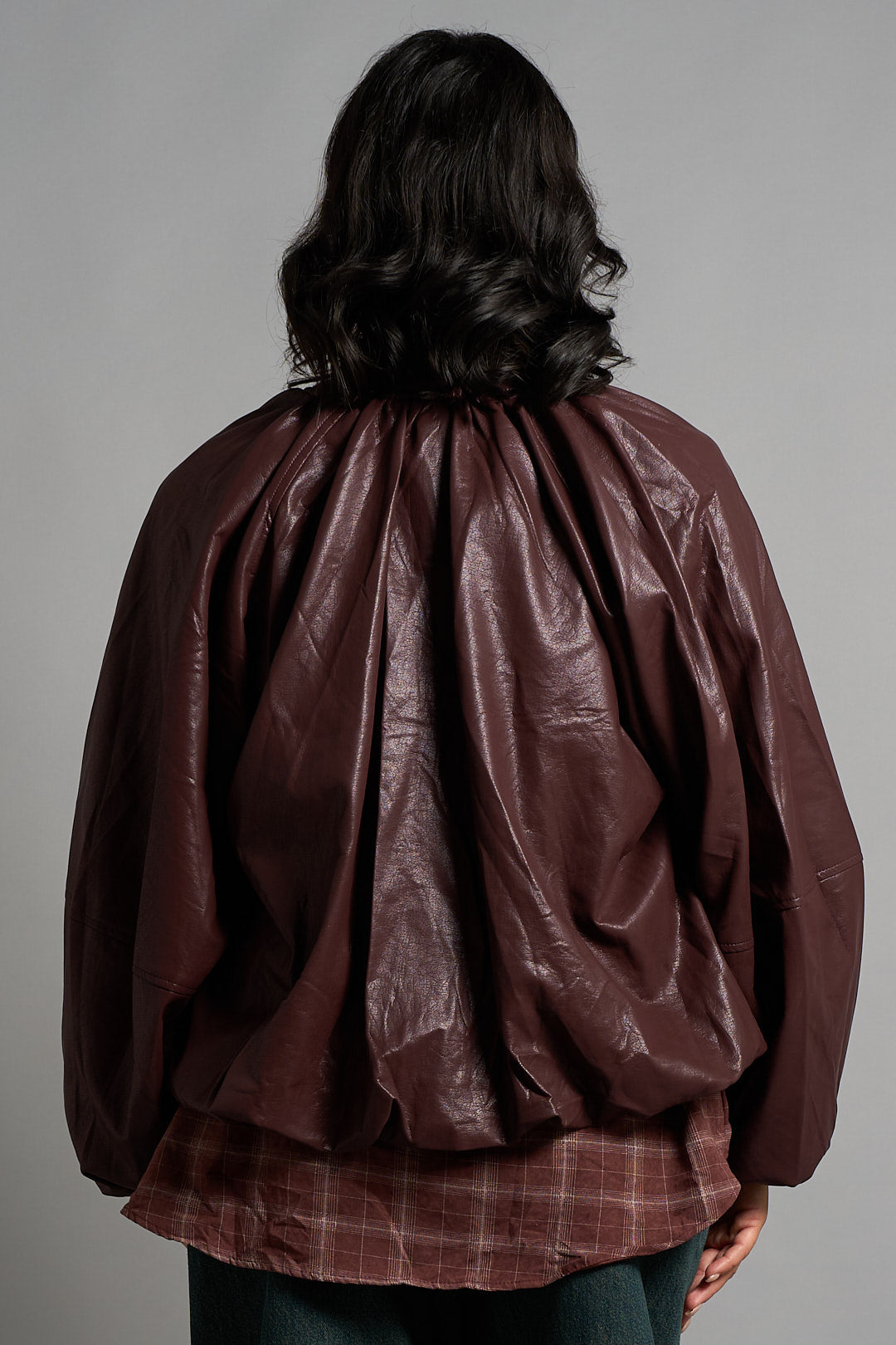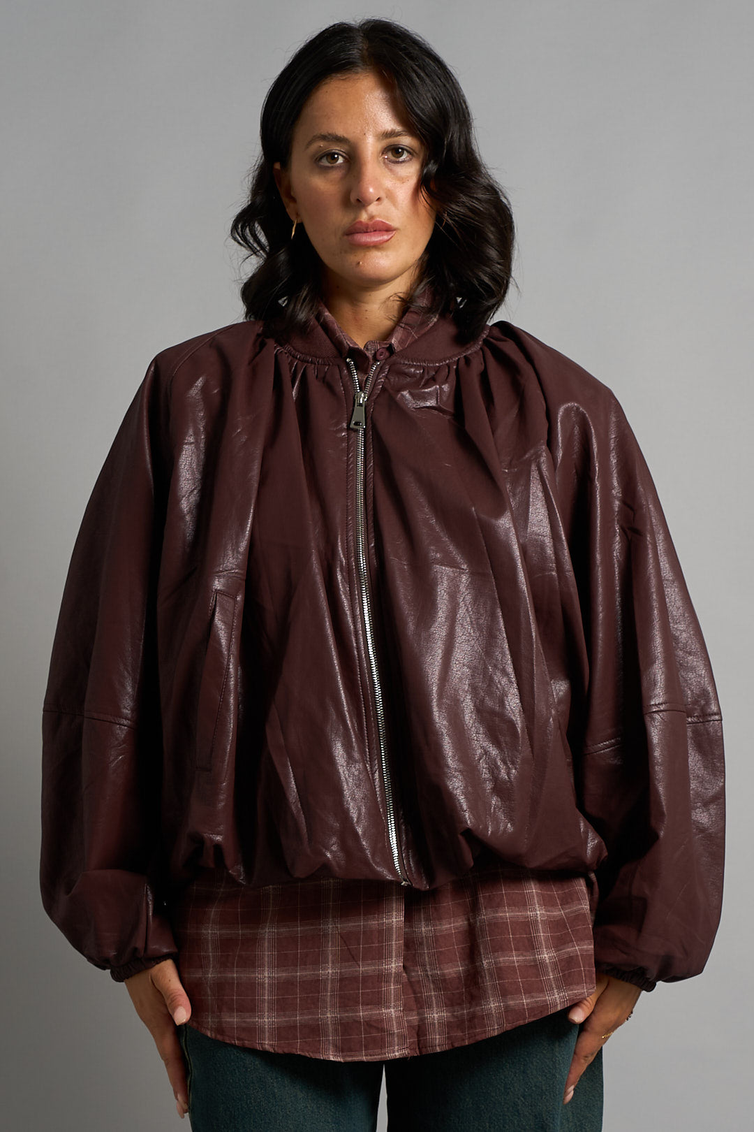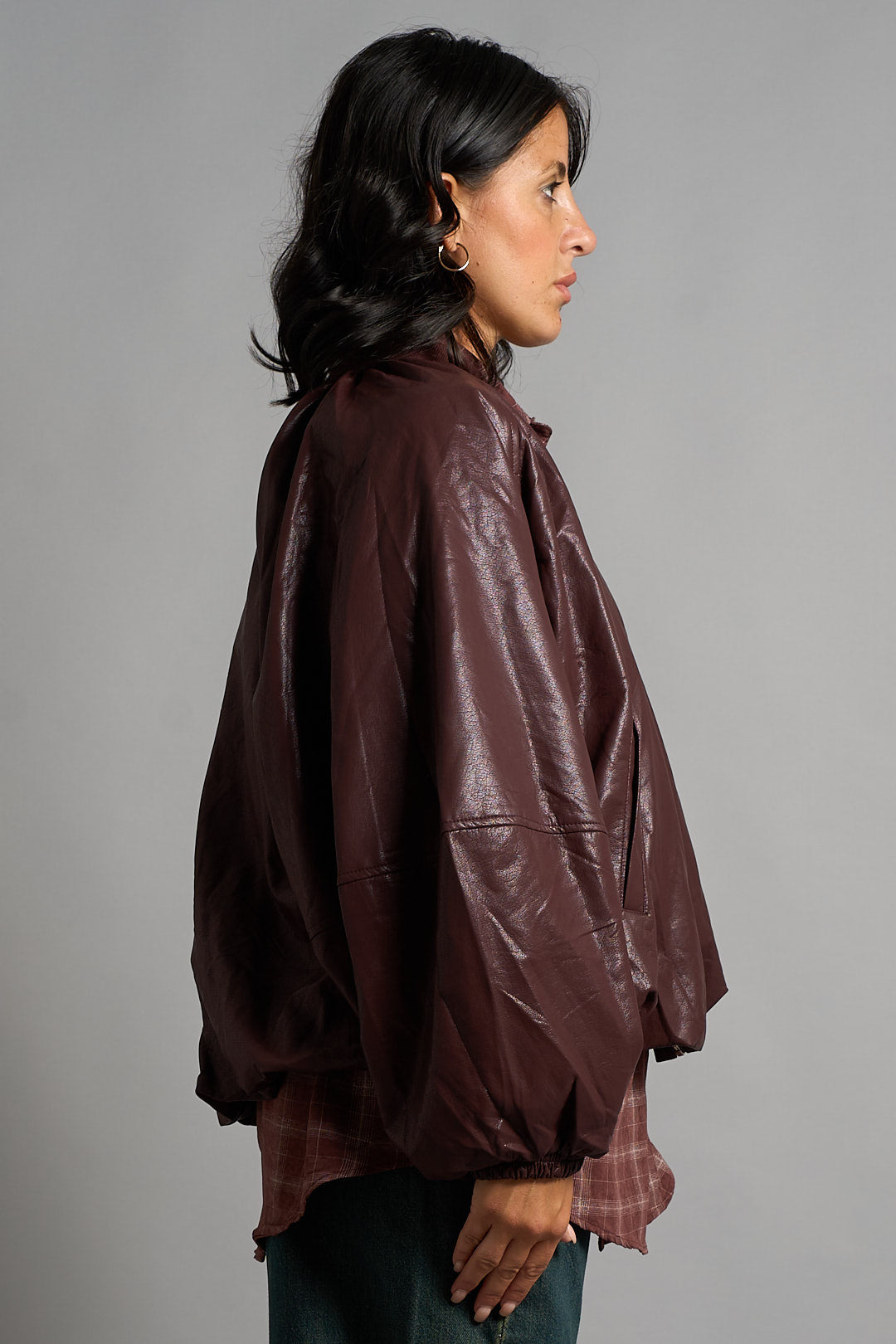 Giacca modello college in ecopelle con zip color argento. Vestibilità over e collo elasticizzato.