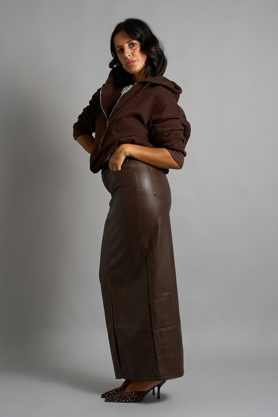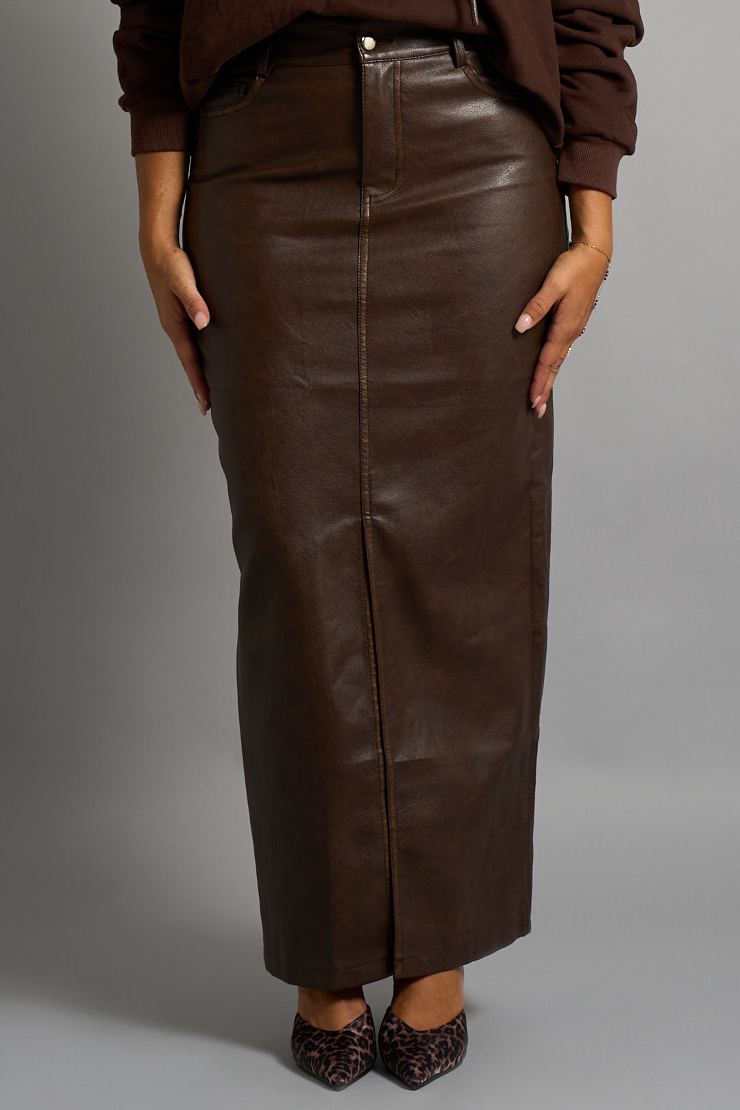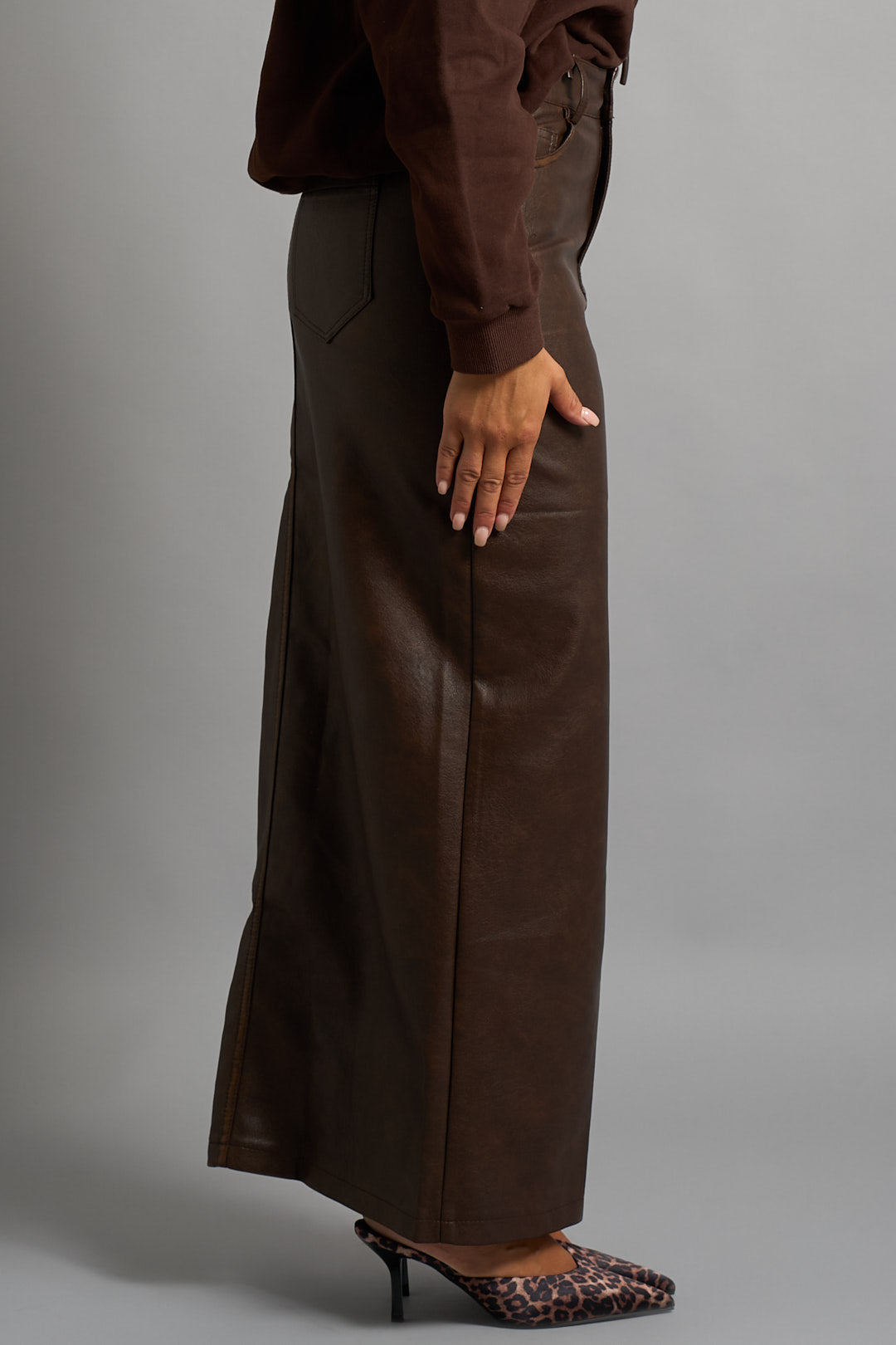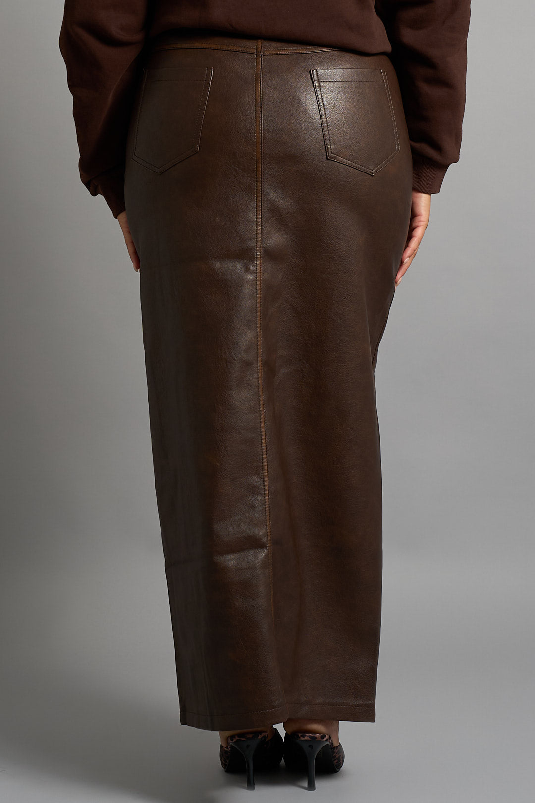 Gonna lunga a tubino in ecopelle con tasche anteriori e posteriori.