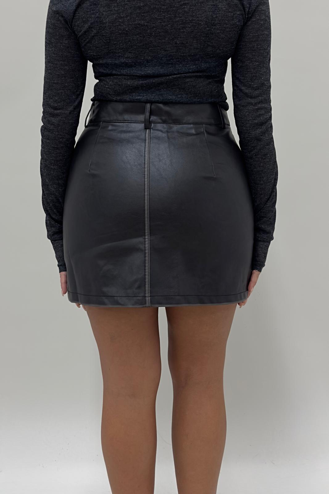 Gonna in ecopelle chiusura cerniera e bottone. Tasche sul davanti con cuciture grigie a contrasto.