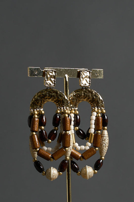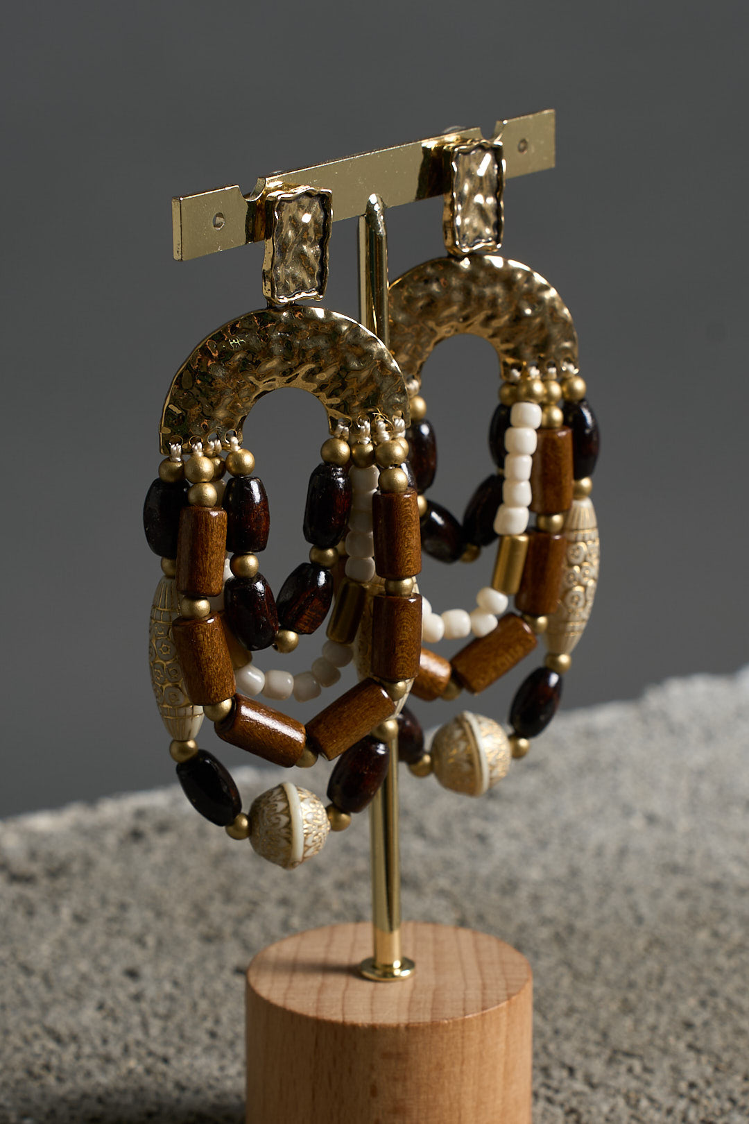 Coppia di orecchini pendenti con dettaglio in metallo oro, chiusura a bottone.